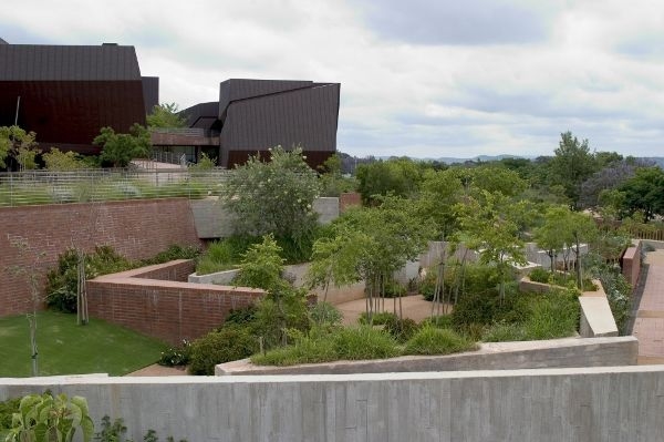 博物館的設(shè)計(jì)概念來自傳統(tǒng)治療師的“愈合”花園,這種花園在北開普省庫魯曼的一個(gè)農(nóng)莊中可以見到。設(shè)計(jì)概念逐步演變,創(chuàng)造了大巨石一樣的體量,其中包含講故事空間。