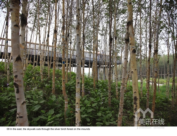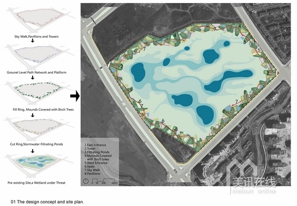 設(shè)計(jì)策略是保留場(chǎng)地中部的大部分區(qū)域作為自然演替區(qū),沿四周通過(guò)挖填方的平衡技術(shù),創(chuàng)造出一系列深淺不一的水坑和高地不一的土丘,成為一條藍(lán)-綠項(xiàng)鏈,形成自然與城市之間的一層過(guò)濾膜和體驗(yàn)界面。沿四周布置雨水進(jìn)水管,收集城市雨水,使其經(jīng)過(guò)水泡系統(tǒng)經(jīng)沉淀和過(guò)濾后進(jìn)入核心區(qū)的自然濕地山丘上密植白樺林,水泡中為鄉(xiāng)土水生和濕生植物群落。高架棧橋連接山丘,布道網(wǎng)絡(luò)穿越于丘林。水泡中設(shè)臨水平臺(tái),丘林上有觀光亭塔之類。創(chuàng)造豐富多樣的體驗(yàn)空間。