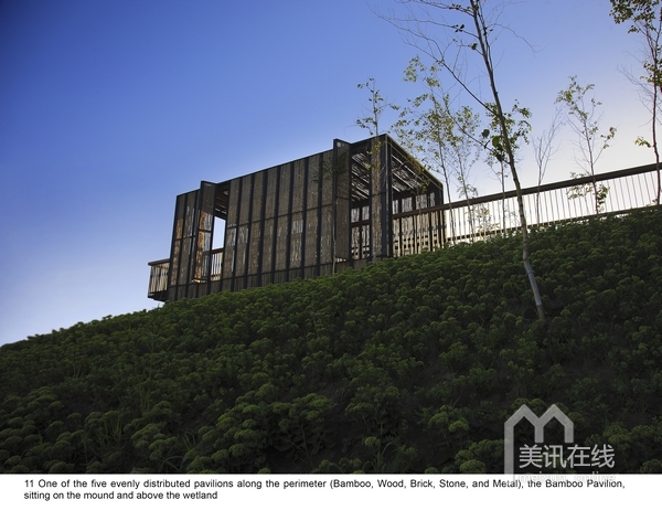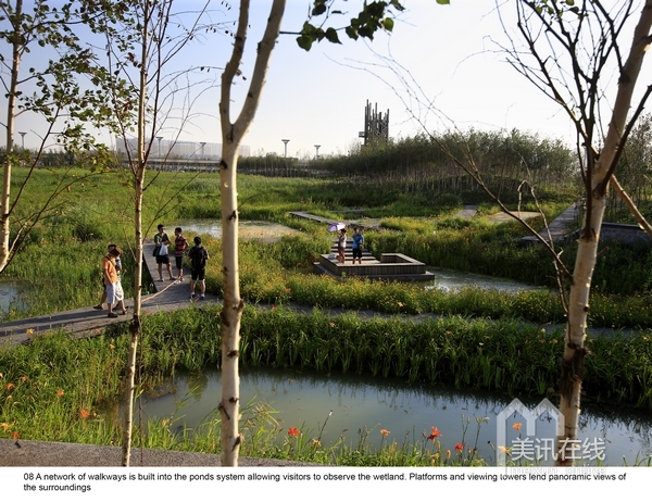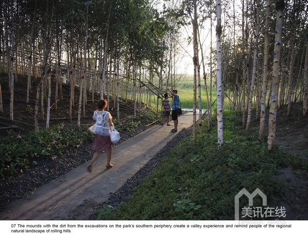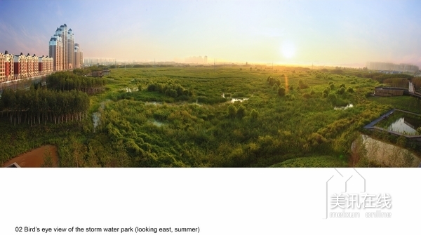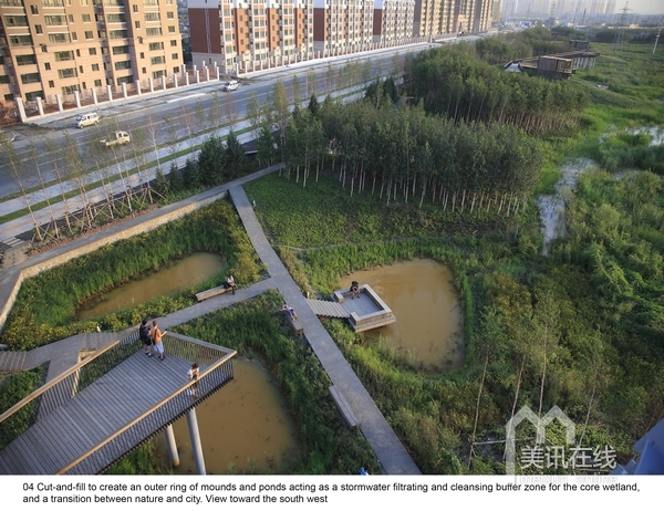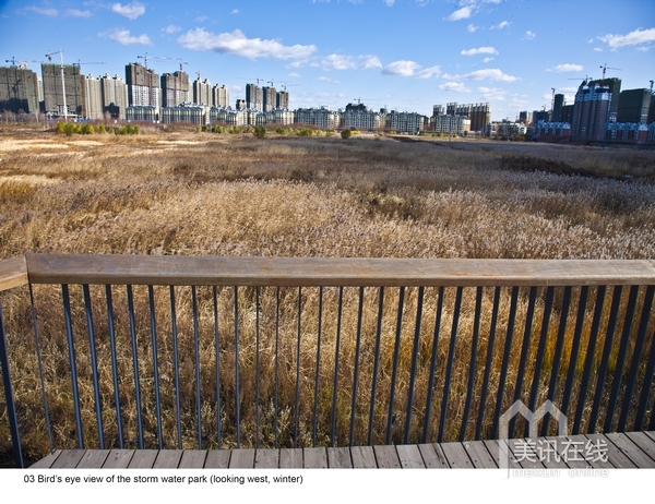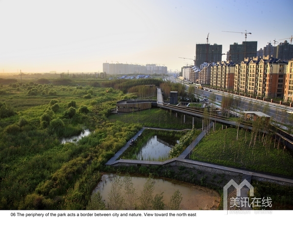2009年中,受當(dāng)?shù)卣校本┩寥司坝^與建筑規(guī)劃設(shè)計(jì)研究院,承擔(dān)了群力新區(qū)的一個(gè)主要公園設(shè)計(jì)。公園占地34公頃,為城市的一個(gè)綠心。場(chǎng)地原為濕地,但由于周邊的道路建設(shè)和高密度城市的發(fā)展,導(dǎo)致該濕地面臨水源枯竭,濕地退化,并將消失的危險(xiǎn)。土人的策略是將該面臨消失的濕地轉(zhuǎn)化為雨洪公園,一方面解決新區(qū)雨洪的排放和滯留,使城市免受澇災(zāi)威脅,同時(shí),利用城市雨洪,恢復(fù)濕地系統(tǒng),營(yíng)造出具有多種生態(tài)服務(wù)的城市生態(tài)基礎(chǔ)設(shè)施。實(shí)踐證明,設(shè)計(jì)獲得了巨大成功,實(shí)現(xiàn)了設(shè)計(jì)的意圖。